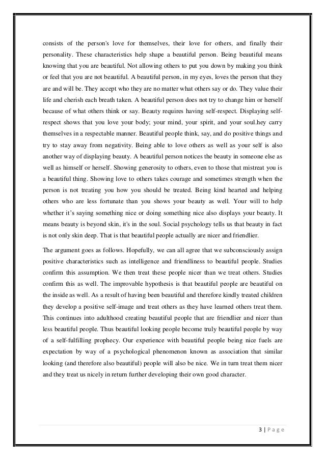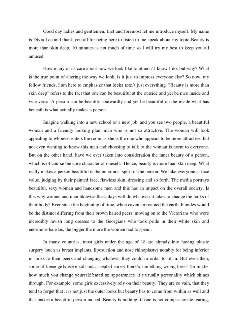 · To start with, I believe outer beauty is subjective, and so is different for everyone, so there can be no set beauty. However, I also believe beauty is not skin deep, but our really beauty is in our individual personality and nature, which also includes our actions. As you get to know someone, the more beautiful they get, as you learn more about them and see them for · Abstract. Beauty is skin deep; refers to the outward beauty of a person. We know and realize that a person can be beautiful on the inside. A person with a beautiful mind, we can say him/her as a nice blogger.com when we listen something beautiful we generally indicate that something outward appearance People’s opinions have popularized on the proverb “ Beauty is only skin deep ”. On the one hand‚ many skeptics are opposed the view that “ Beauty is only skin deep ”. They believe that beauty is always important because whole human beings love beauty. This is especially true for female which is named as the symbol of beauty